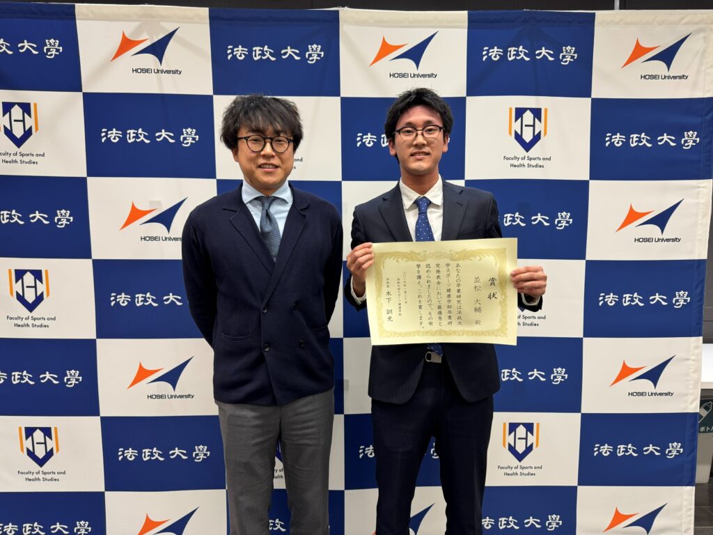 卒業研究発表会にて学部4年生の並松さんが最優秀発表賞を受賞しました 2026年1月30日に開催された卒業研究発表会において、本研究室を代表して並松大輔さんが発表を行いました。発表タイトル「空手道刻み突きにおける到達時間の構造分析 ―反応時間と動作時間からみる達成戦略の多様性―」の内容が高く評価され、最優秀賞を受賞しました。おめでとうございます。 2026.1.31